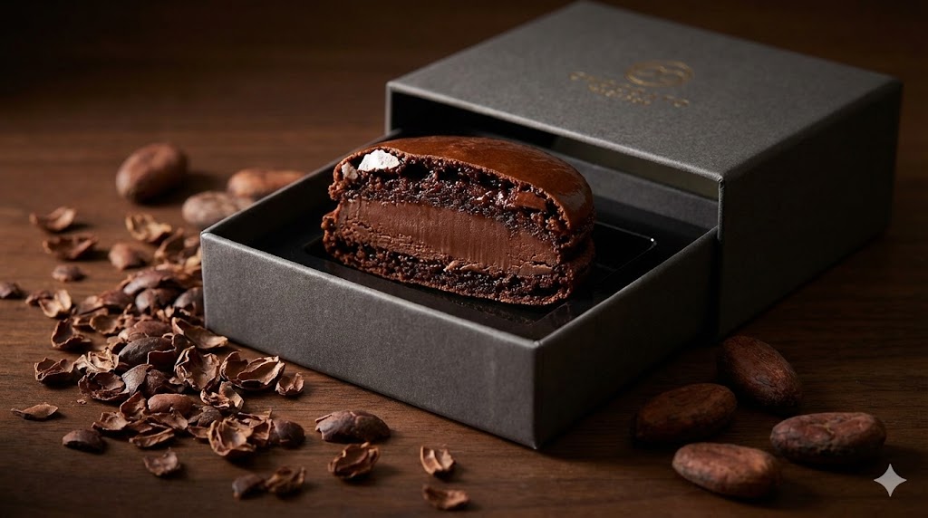 なんと、たった一つのマカロンを作るのに**「1週間」**もの時間をかける、最高級の生チョコマカロンです。 箱を開けた瞬間から始まる「演劇」のような体験と、口の中でほどける濃厚なカカオの魔法。