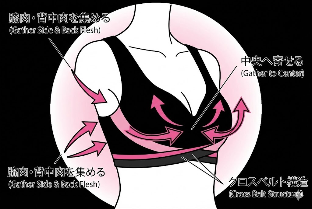 両サイドから中央に向かってクロスするベルト構造が、物理的にバストを中央へ寄せ集めます。